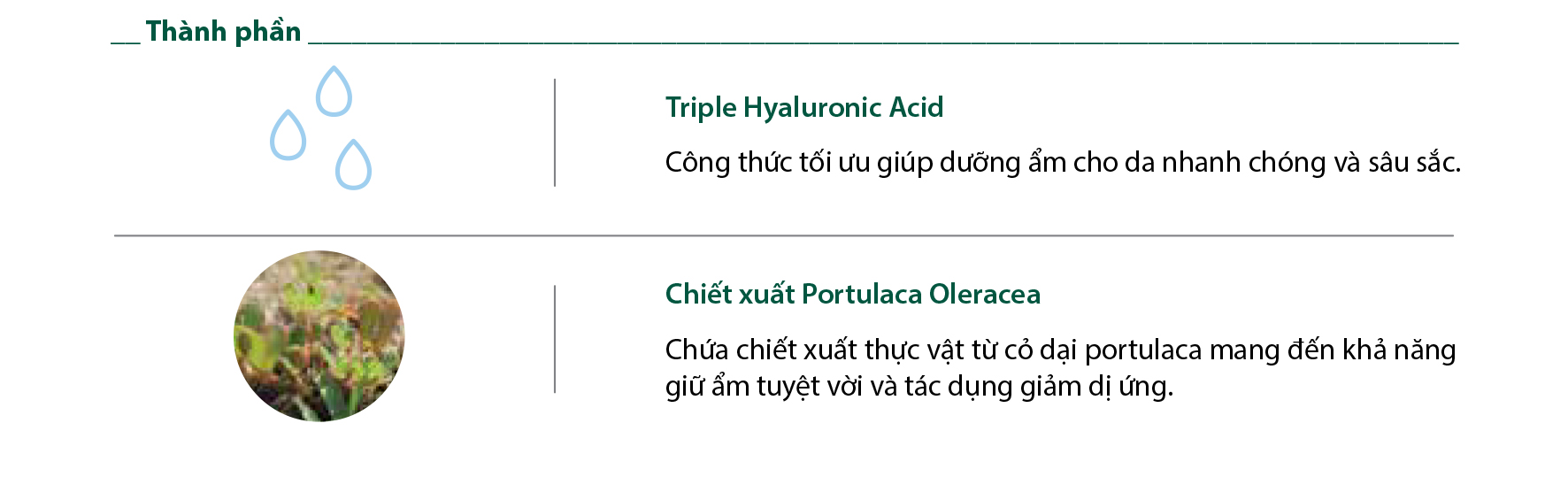 – Chiết xuất Portulaca Oleracea: Chứa chiết xuất thực vật từ cỏ dại portulaca mang đến khả năng giữ ẩm tuyệt vời và tác dụng giảm dị ứng